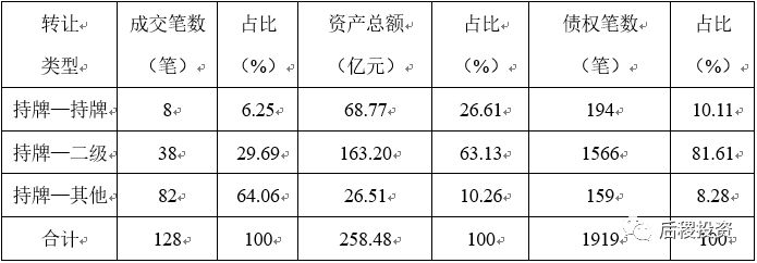 该转让类型中,涉及资产总额最大的交易的转让人为同伦资产管理有限公司,受让人为杭州坤盛资产管理有限公司,资产总额达到6亿元,涉及38笔债权。资产总额第二大的交易的转让人为嘉兴优元投资合伙企业(有限合伙),执行事务合伙人为江苏成安股权投资基金管理有限公司,受让人为张家港苏润嘉投资合伙企业(有限合伙),穿透后可发现,股东背景为东方成安资产管理有限公司,也就是说,转让人、受让人具有关联关系,涉及资产总额为4.62亿元,涉及债权41笔。其余交易均在3亿元以下。