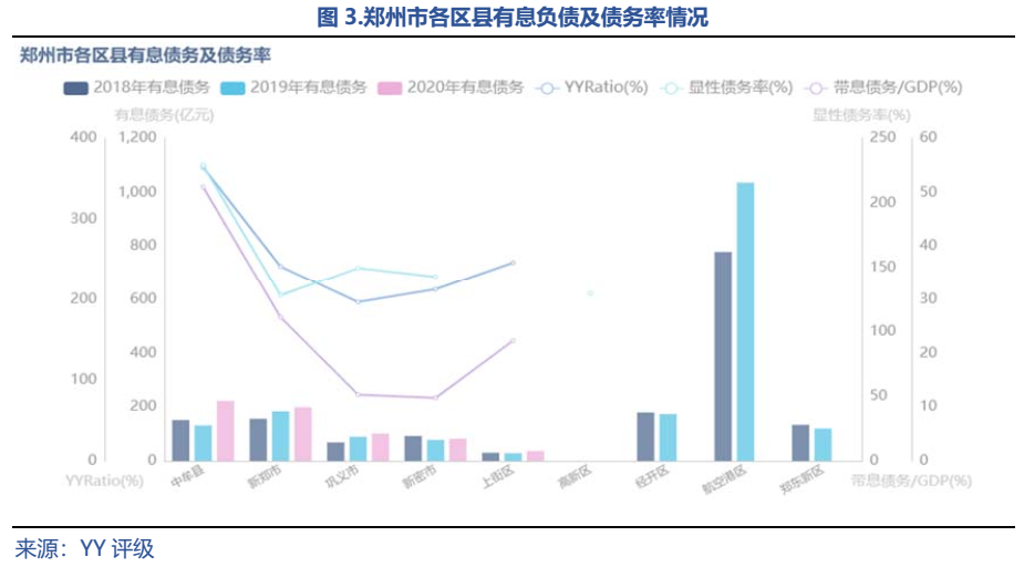 郑州市总体债务率不高,分区域看,因发展需要,航空港区2018、2019年有息债务“一骑绝尘”,但2020年数据尚未披露完整。从目前可得的2020年的债务数据来看,中牟县的带息债务绝对值和债务率均最高,截至2020年末,中牟县有息债务余额为222.32亿元,YY-Ratio为364.46%,债务风险并不高;新郑市的有息债务余额和债务率次之;值得注意的是,上街区的有息债务余额虽然不高,但因财政实力较弱,YY-Ratio较高。