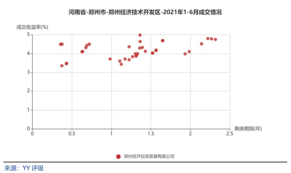 将郑州市城投平台按照行政层级和所属区域,分为9类分别展示成交情况。具体来看,郑州市级平台成交活跃,成交收益率分散在3%~6%,基本随着剩余期限递增;中牟县成交收益率相对较高,在5%~7%;巩义市分散在3%~4%和6%~7%两个区间;新郑市、航空港区、郑东新区均集中在4%~6%;经开区集中在4%附近;新密市成交收益率相对分散;上街区仅一个成交主体。