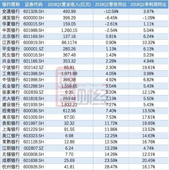 先看在A股上市的26家银行2018年一季度的营收变动情况: