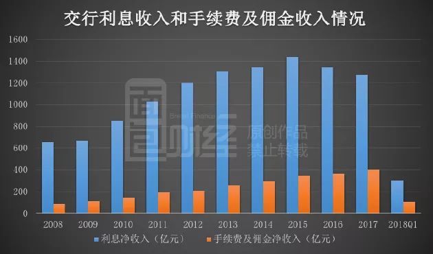 2018年一季度,交行的手续费及佣金净收入为108.44亿元,同比减少3.86%,出现上市以来较为罕见的下降。