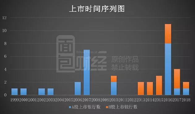 以下是面包财经按首发日期为大家整理的目前已上市大陆银行的上市时间序列图,以此可以更直观的看到中国银行史上已经出现过的两次上市大潮。