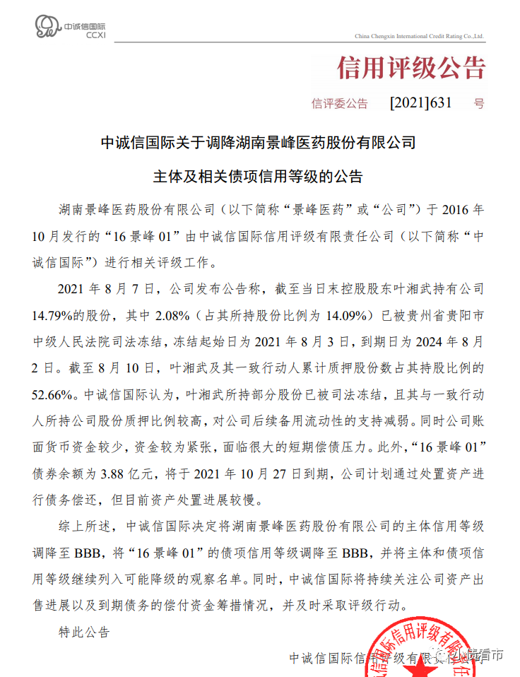 8月17日,中诚信国际公告称,决定将景峰医药(000908.SZ)主体和“16景峰01”的债项信用等级由“A”调降至“BBB”,并列入可能降级的观察名单。