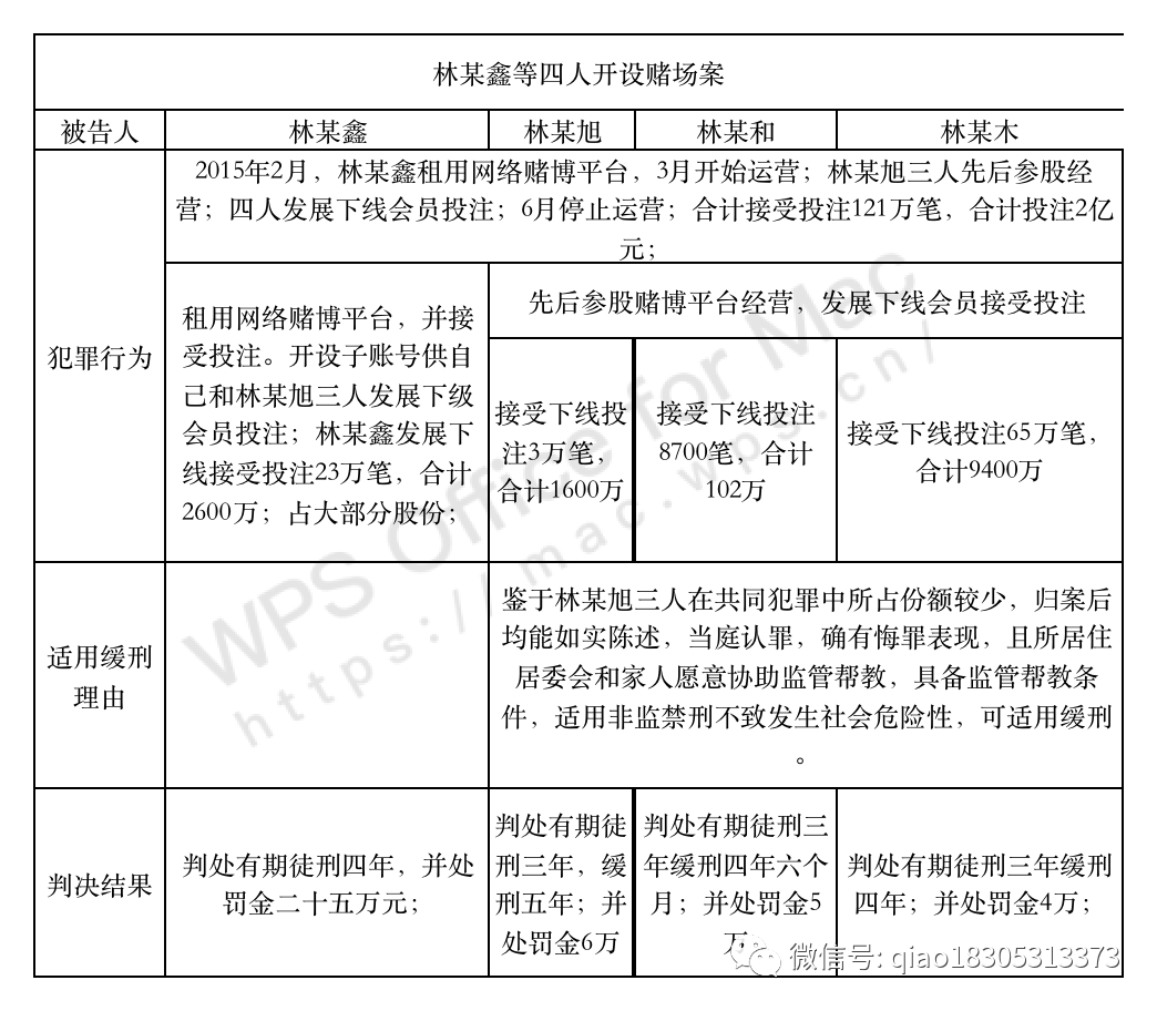 本文以优案评析中的林某开设赌场案举例,该案即开设赌场罪达到“情节严重”,但是对其中三名被告人均认定了“犯罪情节较轻”,均适用了缓刑。