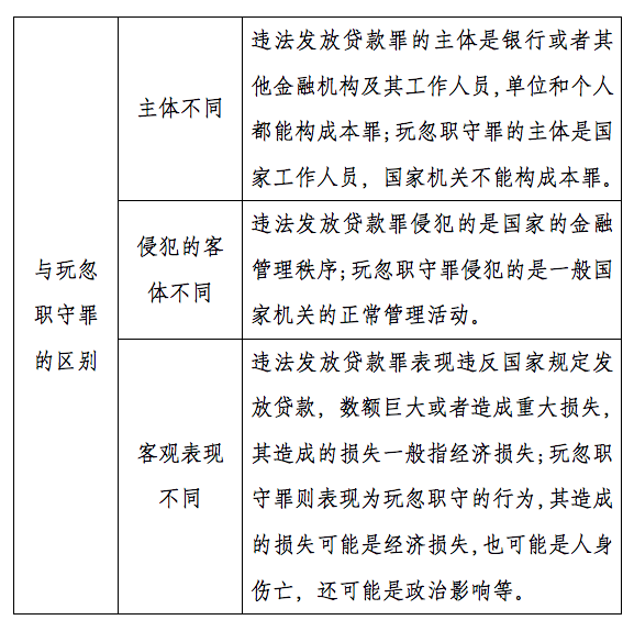 发放贷款的行为构成本罪客观方面的前提与基础。如果没有发放贷款的行为,即使具有其他玩忽职守如擅自离开工作岗位,滥用职权如报销非法的开支等行为,办不构成本罪,构成犯罪的,应以他罪处罚。结合上文的“违反国家规定”,本罪在实践中具体表现为:依法应对借款人是否符合有关贷款的条件进行审查而不审查;依法应对借款人的信用等级、贷款的用途进行审查而不审查;依法应对借款的安全性、合法性、赢利性进行调查、评估却不调查、评估;依法应当要求借款人提供担保而未提供,或者未对担保物进行审查;明知申请借款人不符合条件仍然向其发放贷款等等。