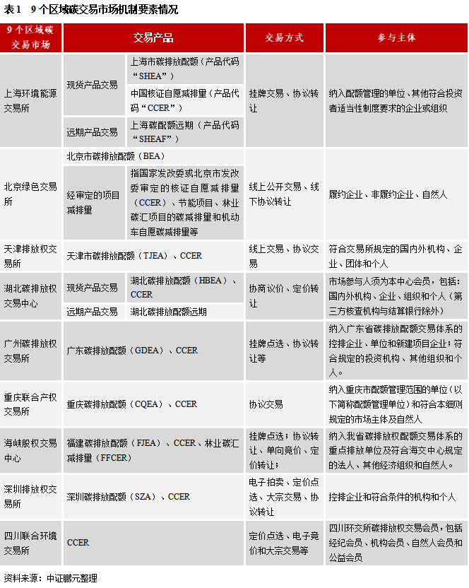 2011年10月,发改委发布《关于开展碳排放权交易试点工作的通知》(发改办气候[2011]2601号),同意在北京、天津、上海、重庆、湖北、广东及深圳开展碳排放权交易试点。经过近2年的筹备,2013年初,除重庆和湖北外的5个试点地区碳排放交易场所通过发改委备案,2014年4月,重庆和湖北两地碳排放交易场所也通过发改委备案。2013年6月至2014年6月期间,试点地区碳排放交易陆续开展,其中2013年6月18日,深圳试点率先启动交易。2016年,在首批7个试点后,四川、福建也先后成为国家备案碳交易机构的省份,当年12月两省碳排放交易场所先后启动。至今,全国共有9个区域碳交易市场。碳交易市场是利用市场机制来控制和减少温室气体排放,推动绿色低碳发展。