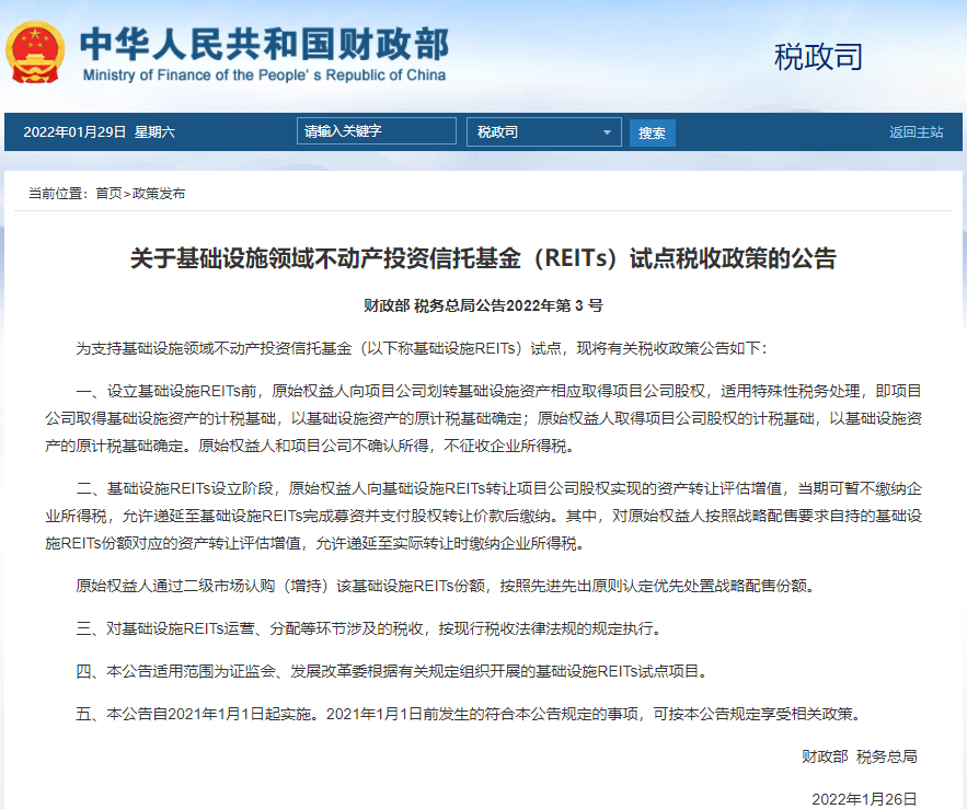 关于基础设施领域不动产投资信托基金(REITs)试点税收政策的公告
