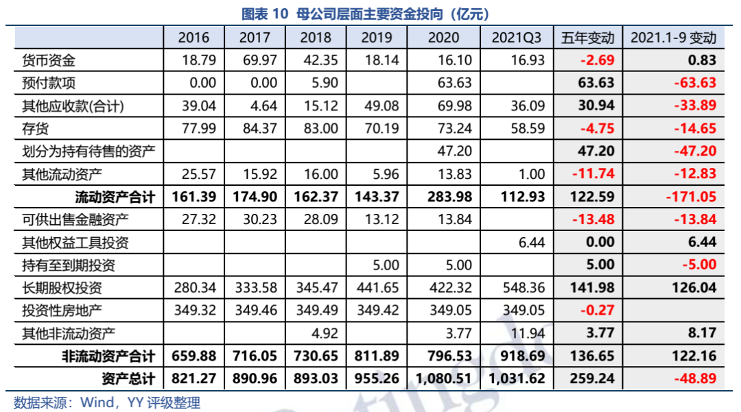 母公司层面,依赖子公司运营为主,本部仅为融资属性,营收较少,利润依赖于资产处置。母公司资产集中在长股投和投资性房地产上,投资性房地产主要是2.5万亩盐田,短期变现能力弱。长股投规模持续增长,但多数市场化程度低,市场化程度较高/变现能力较强的合计约71.25亿元。