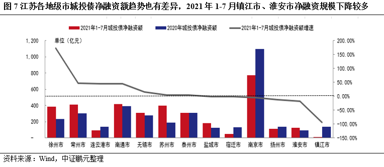 江苏各地级市城投债净融资额趋势也有差异,2021年1-7月镇江市、淮安市净融资规模下降较多