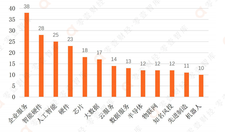 在所投企业的特点上,深创投在数字科技领域,更加侧重硬件以及人工智能方面的布局。根据零壹智库不完全统计,在将深创投2019至2021年投资的数字科技企业的各类特点标签化之后,有13个标签的出现次数不低于10次,其中有2个标签含有“硬件”字眼,还有4个标签与硬件有关联(芯片、半导体、先进制造、机器人)。此外,在这些出现次数较多的标签当中,“企业服务”出现的次数最多,达到38次;“人工智能”出现了28次,排名第二。
