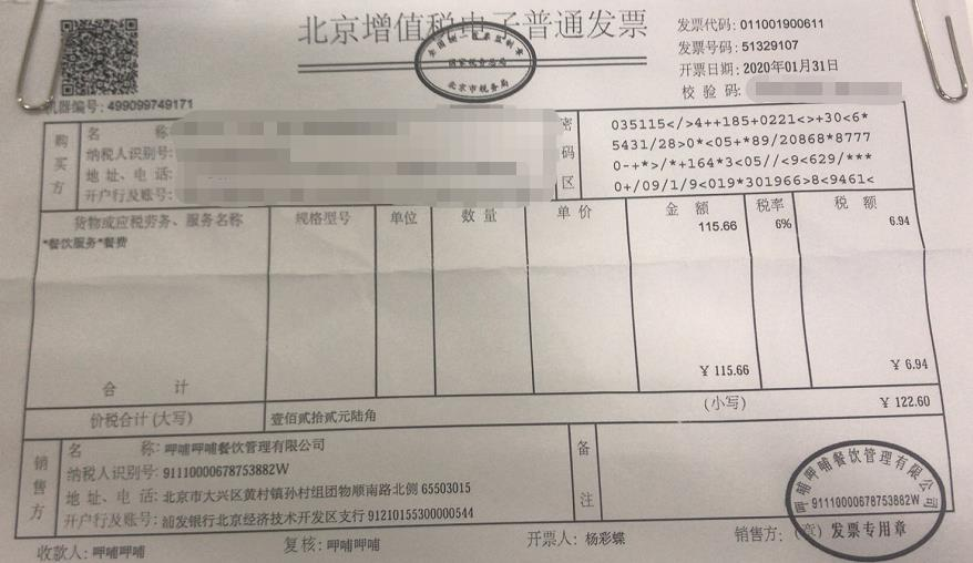 以日常生活中的餐饮为例,在消费结束后开具增值税发票,发票金额中经常会出现三个金额,如下图所示,作为消费者最终要支付的金额为122.6元。但通过发票可以看出,其组成结构为两部分:即115.66元+6.94元。115.6元是餐饮服务实际发生的金额;6.94元是伴随这项消费产生的增值税。