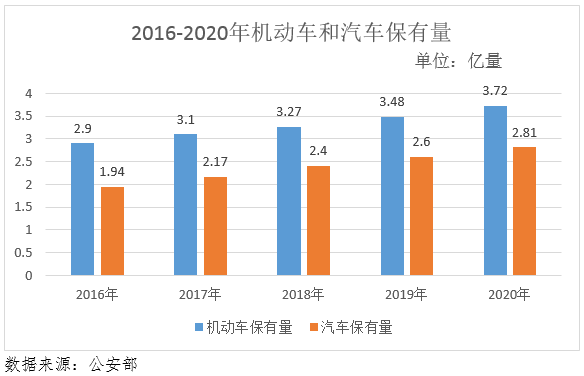 公安部统计数据显示,2020年全国机动车保有量达3.72亿量,其中汽车2.81亿量。2020年全国新注册登记机动车3328万辆,新领证驾驶人2231万人。