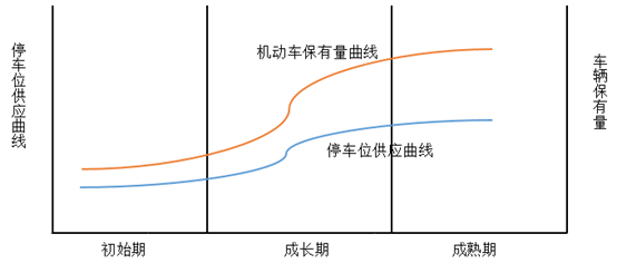 居民消费水平的提高拉动了汽车消费,而汽车保有量的持续提高促进了停车设施需求的扩大。机动车保有量与停车泊位在不同发展时期的关系如下图所示: