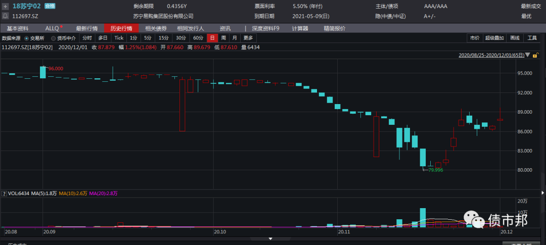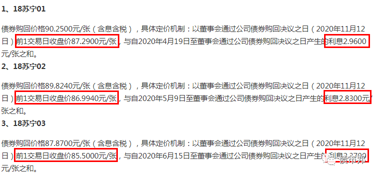 相关债券的回购价格,是11月12号大跌之后的收盘价+应计利息来确定的。以18苏宁01为例,回购净价仅为87.29元,也就是说,发行人借了100元的本金,现在只用还87.29元了。