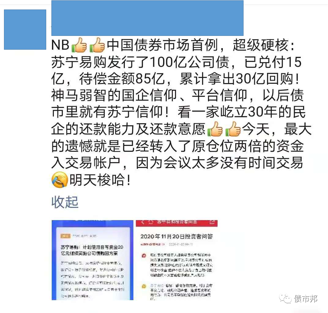该举措迅速博得了债券圈的一片掌声,被誉为有担当有作为的优秀发行人,可谓是赚足了市场的眼球。苏宁相关同事甚至在朋友圈喊出了“神马弱智的国企信仰、平台信仰,以后债市里就有苏宁信仰”的口号。颇有老王当年“神马清华北大,不如胆子大”的神评论风采。