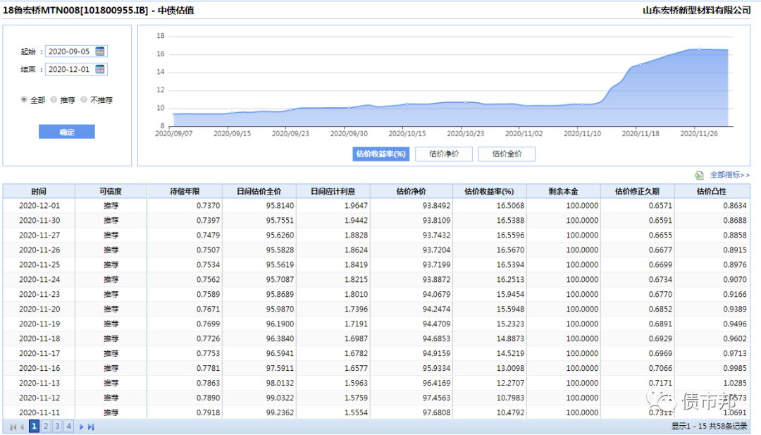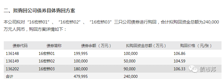 但后来细细一分析,不对啊,宏桥回购方案只是针对3笔马上要在明年1月份到期的公司债,就连2月份要到期的16宏桥05都不愿意带上。所以别看这三笔待回购债券的到期收益率高,但是净价和面值差的不多。