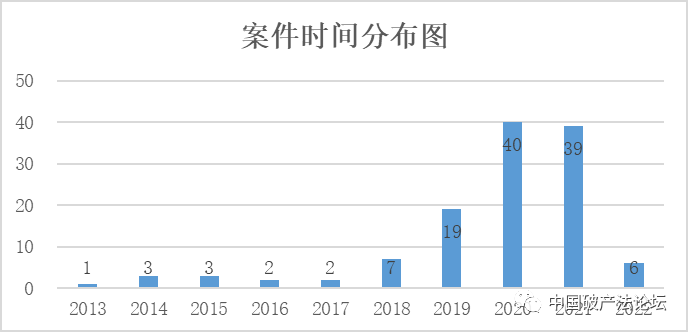 如图1-1所示,公开检索的案件数量在2018年前,每年案件分布比较均匀,且案件量较小,2018年起有显著的增加,2020年和2022年基本稳定在40件左右,鉴于2022年度尚未完结,相关数据尚不完整。2020至2022年度截至目前的案件数量已占约70%。