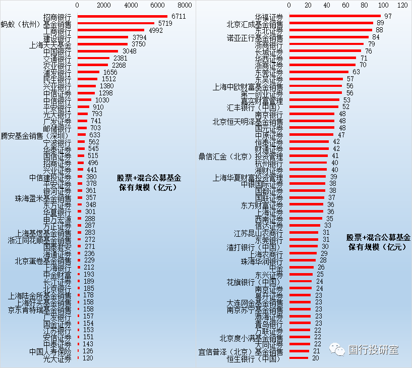 1、仅1家券商的保有规模超过千亿元,即中信证券(1315亿元),占全部47家券商系销售机构保有规模合计的13.63%。