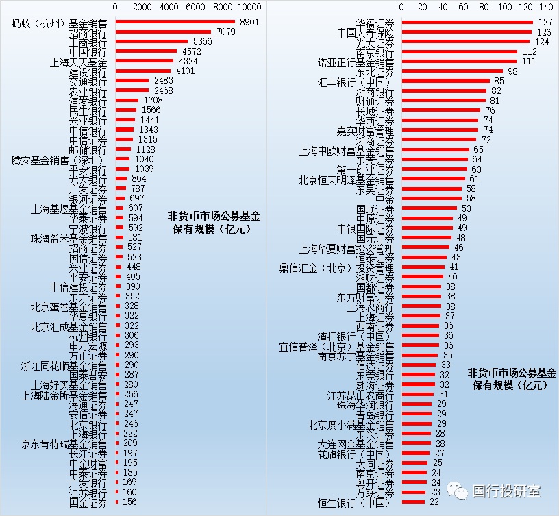 (二)100大机构的非货币公募基金保有量合计为65138亿元,其中银行为37698亿元(占比达到57.87%)、三方销售机构为17664亿元(占比为27.12%)、券商为9650亿元(占比为14.81%)。可以看出,虽然券商数量最多、但比例却相对较低,即公募基金保有量主要集中在银行和三方销售机构(合计占85%)。