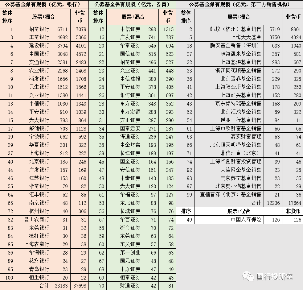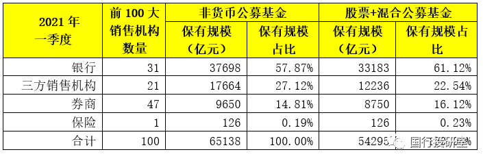 一、前100大公募基金销售机构:银行31家、券商47家、三方销售机构21家