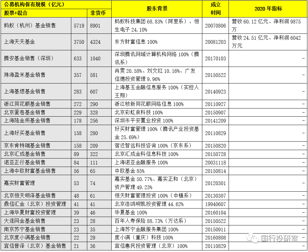 1、目前21家三方销售机构中,有3家机构的非货币公募基金保有规模超过1000亿元,合计达到14265亿元、占全部21家机构的81%。这3家机构从高到低依次为蚂蚁(杭州)基金销售(8901亿元)、上海天天基金(4324亿元)和腾安基金销售(1040亿元)。即3家机构分别为阿里系、东方财富系和腾讯系。