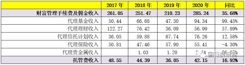 以招行为例,2020年招行财富管理业务贡献的中收规模达到285.24亿元,同比大幅增长35.68%。其中,代理基金、代理理财、代理信托实现的收入分别高达94.34亿元、56.99亿元和76.26亿元,同比分别增加99.45%、57.89%和12.58%。