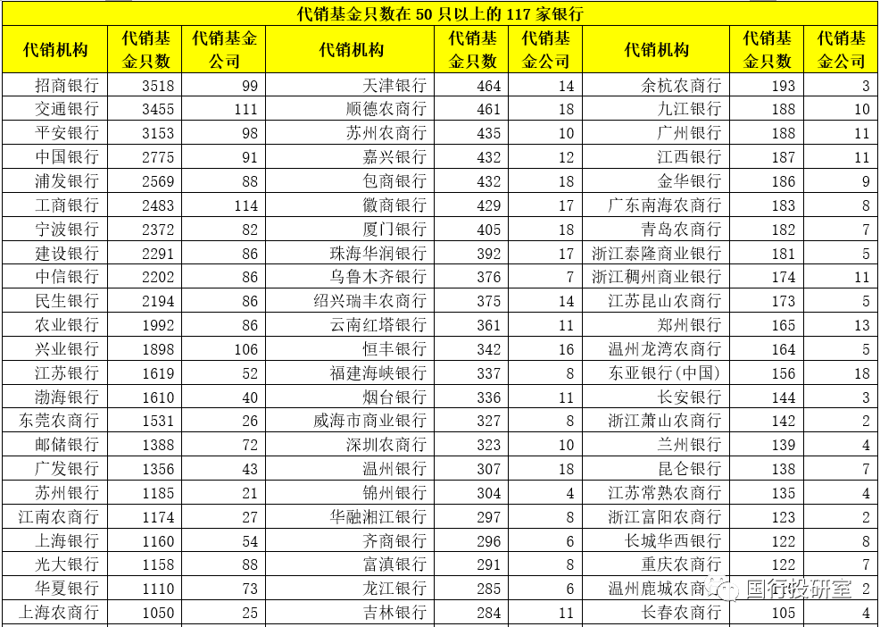 北京银行、杭州银行、微众银行、泉州银行、东莞银行、青岛银行、晋商银行、南京银行、北京农商行、中原银行、大连银行、浙商银行、西安银行、天府银行、河北银行与哈尔滨银行等16家银行的代销基金只数均超过500只。