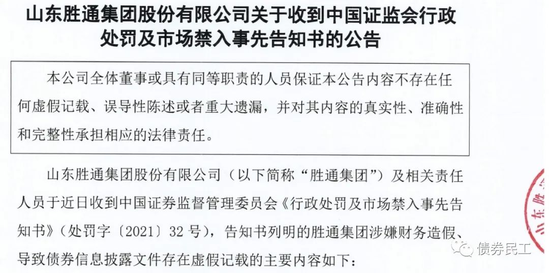 根据山东胜通集团于2021年5月14日披露的公告文件,中国证监会已经对公司下发行政处罚和市场禁入事先告知书,主要原因是公司“涉嫌财务造假、导致债券信息披露文件存在虚假记载”。