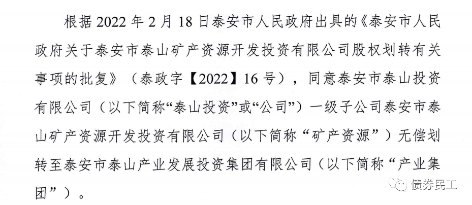 1、根据泰安市泰山投资有限公司(主体信用等级AA+)2022年2月21日的公告,将子公司泰安市泰山矿产资源开发投资有限公司无偿划转至泰安市泰山产业发展投资集团有限公司。泰安市泰山产业发展投资集团有限公司未发行过债券。
