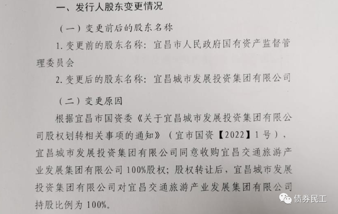6、根据宜昌交通旅游产业发展集团有限公司(主体信用等级AA)2022年1月25日的公告,宜昌城市发展投资集团同意收购宜昌交通旅游产业发展集团100%股权;股权转让后,宜昌城市发展投资集团对公司的股权比例为100%。宜昌城市发展投资集团(主体信用等级AA+),存续债券金额164.50亿元。