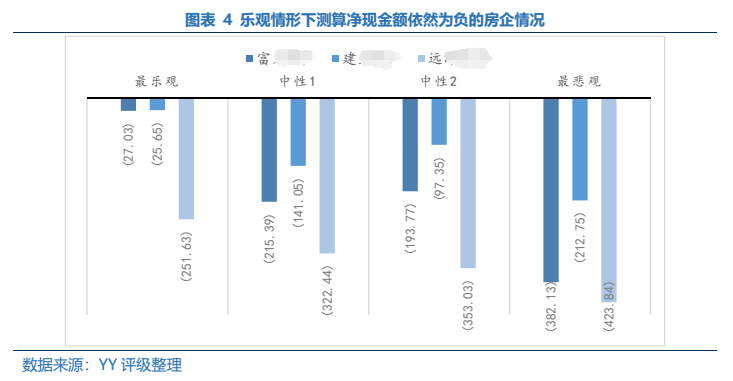 我们的假设最核心的是假设企业不再拿地和到期债务清偿为主(含可动用货币资金),在此基础上大致基于以下次生假设:分2个维度,各区分2种情形:周转去化率乐观及悲观分别为80%、50%;销售回款率乐观时80%,悲观时仅为50%,总计从乐观到悲观延伸4种组合。