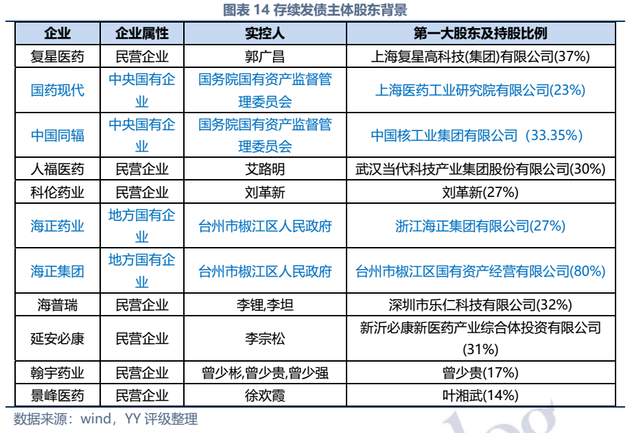 截至2022年3月末西药行业发债主体存续债券余额仅214亿元,存续债主体11家(含已违约的延安必康、已展期的景峰医药),具体来看:复星医药、国药现代、人福医药、海正药业、延安必康、翰宇药业和景峰药业拥有较多样化的产品布局,复星医药(在抗感染、中枢神经和消化系统)、国药现代(在抗感染、心脑血管)和人福医药(在心脑血管)具备较高的行业地位,中国同辐、科伦药业和海普瑞产品则多聚焦于某一细分领域。财务方面,整体销售毛利率较高(平均约50%),但销售费用对利润侵蚀较大(销售费用/营收平均30%),存续发行人中除延安必康、景峰医药和翰宇药业净利润出现亏损外,其他表现尚可;资产及负债方面,复星医药总资产显著高于其他企业,规模优势显著;海正集团本部杠杆率很高,需关注债务压力;行业整体短债占比较高,存在一定流动性压力。
