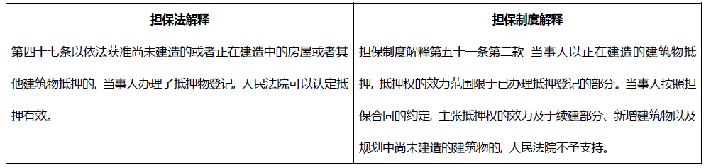 从条款本身来看, 《民法典》对于在建工程抵押权的规定沿袭自《物权法》, 并没有做实质改动。甚至, 担保制度解释第五十一条第二款也并非直接对于《民法典》条款的解释。根据《担保制度解释理解与适用》, 担保制度解释该条款是对于最高人民法院关于适用《中华人民共和国担保法》若干问题(以下简称“担保法解释”)第四十七条规定的进一步明确规定, 明确抵押权的效力范围。根据《时间效力规定》第四条的规定, 民法典施行前的法律事实引起的民事纠纷案件, 当时的法律、司法解释仅有原则性规定而民法典有具体规定的, 适用当时的法律、司法解释的规定, 但是可以依据民法典具体规定进行裁判说理。因此, 依据担保制度解释进行裁判说理已对于此前“在建工程抵押的范围”不同认定的定纷止争, 已足以让司法机关在审理案件时形成确定的裁判观点。而这无疑是一剂强心剂, 让房地产企业那些已办理抵押的在建工程似乎又“焕发”了新的价值。