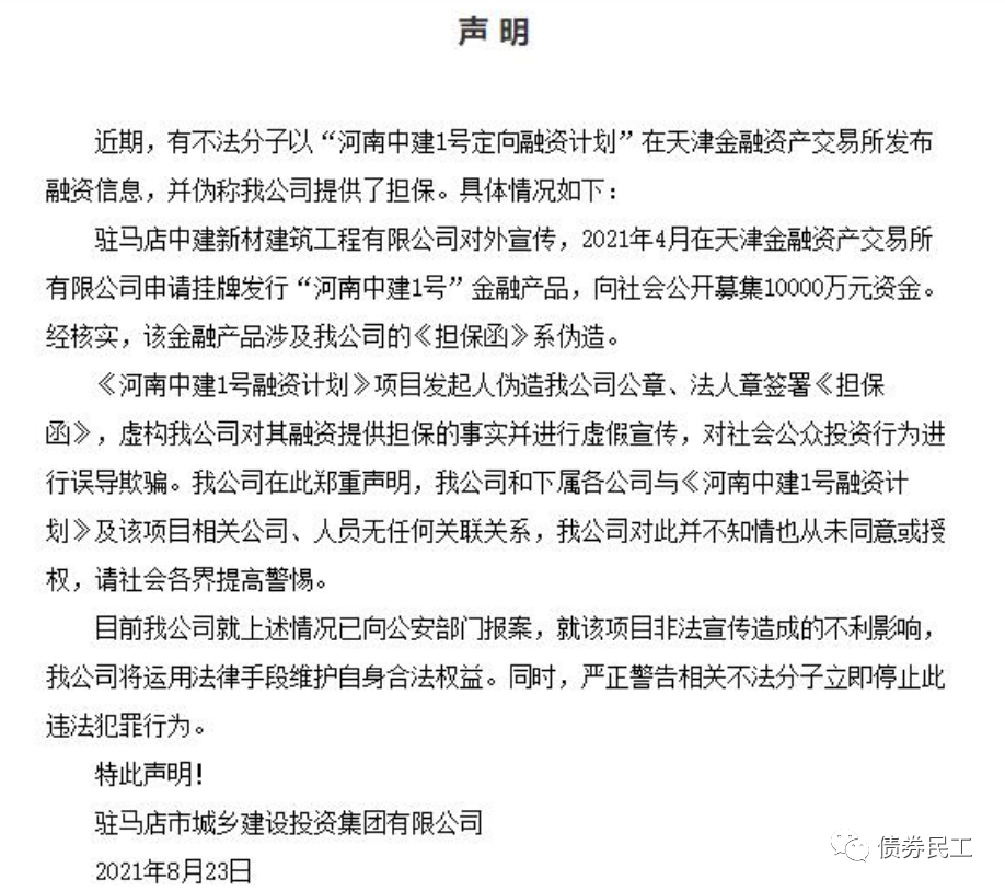 2、2021年8月23日,驻马店市城乡建设投资集团有限公司发布声明表示,有不法分子以“河南中建1号定向融资计划”在天津金融资产交易所发布定融产品信息,伪造了公司的担保函。
