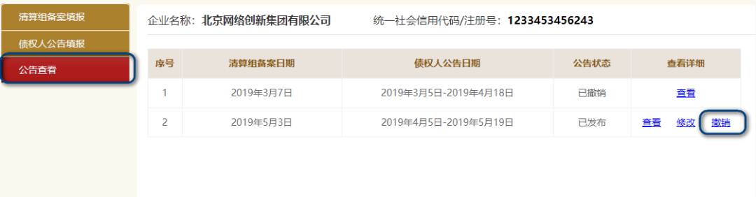 3.1进入“公告查看”页面,点击要撤销的备案记录后的“撤销”