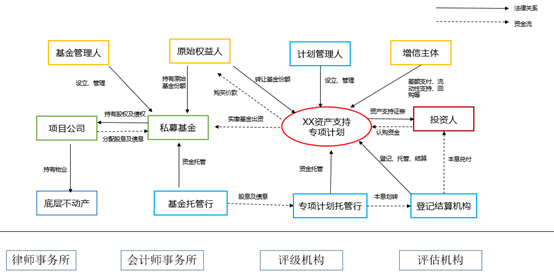 通过系列资产重组安排,实现私募基金持有项目公司的股权和债权,项目公司持有物业资产的结构。资产管理人向投资者募集资金设立专项资产支持计划,并发行资产支持证券。管理人以认购资金向原始权益人购买原始权益人持有的基金份额及其相关附属担保权益(如有),实现基础资产由原始权益人向专项计划的转让。