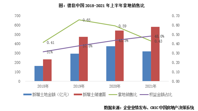 下半年拿地力度收缩明显,新增土储权益比例48%。2021年全年,德信中国共斩获32宗土地,新增土储投资总额318.0亿元,新增土储建面581.1万平方米。拿地销售比0.43,超出百强房企平均的0.25。主要是上半年拿地较多,下半年以来企业仅斩获5幅土地,收缩明显。权益方面,按拿地总价口径,2021年德信新增土储权益比例依然在50%以下,为48.0%,新增项目中仅1个为全资。一直以来,德信的权益占比都比较低,虽然这种模式能够帮助企业短期冲刺业绩,但是同时也大量侵蚀企业收入,造成空心化的增长。