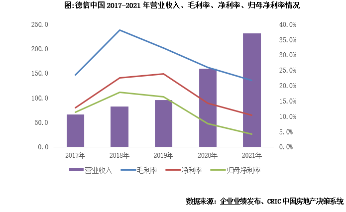 【营收与规模差异大,盈利能力接连下降】2021年德信实现营业收入231.1亿元,同比增长45.6%,其中物业开发收入229.3亿元,占集团总收入的99.2%。以营业收入/销售规模来看,2020年德信这一比例仅有25%,低于百强上市房企2020年46%平均水平的21个百分点,今年该比例依然很低,只有31%。2021年德信中国实现毛利润50.1亿元,同比上升22.0%,整体毛利率21.8%,同比下滑4.2个百分点。实现净利润23.8亿元,净利率10.3%,相较2020年同期下滑3.9个百分点,实现归母净利润9.4亿元,归母净利率仅4.1%。从盈利能力来说,企业的各项指标已经连续3年出现下滑,尤其是大量的合作项目侵蚀收入,导致企业归母净利率只有4.1%