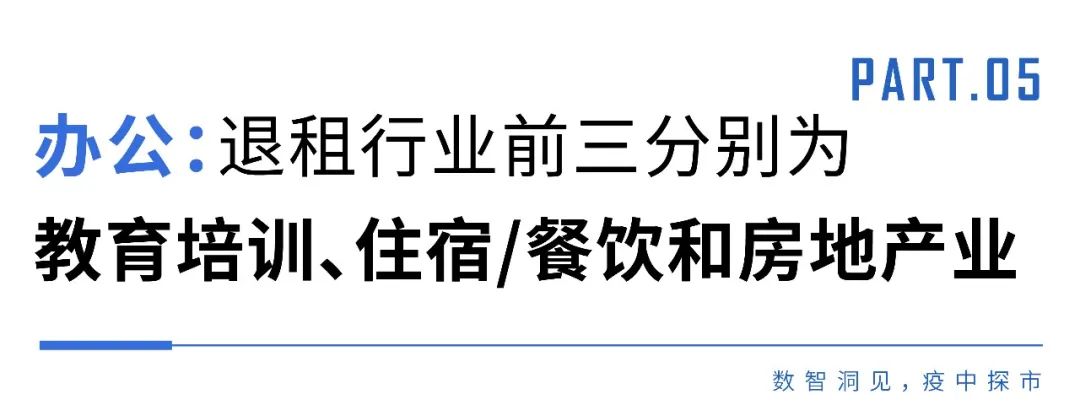 疫情期间,克而瑞资管在北上广深等一线城市的抽样调研数据显示,1-4月,写字楼退租行业排名前三分别为教育培训、住宿/餐饮和房地产业,各占55.2%、50.8%和46.3%。退租率最低的为政府机构和能源,仅占1.5%。
