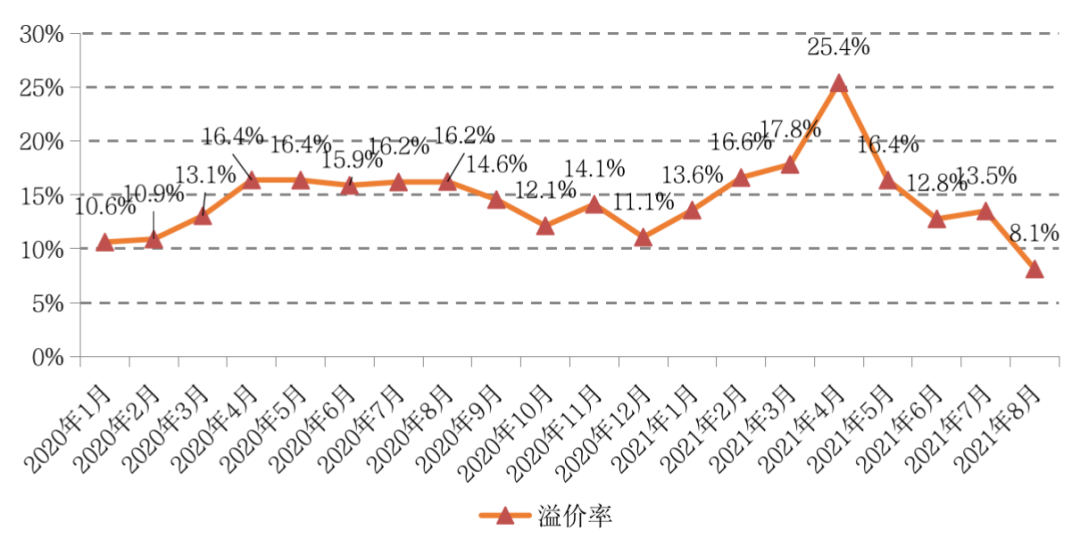 值得注意的是,由于热点城市在8月纷纷迎来溢价、地价的管控,加之优质地块成交占比明显减少,地市场溢价率较上月大幅下滑,8月环比减少5.4个百分点,降至8.1%,创下2020年以来的最低值。