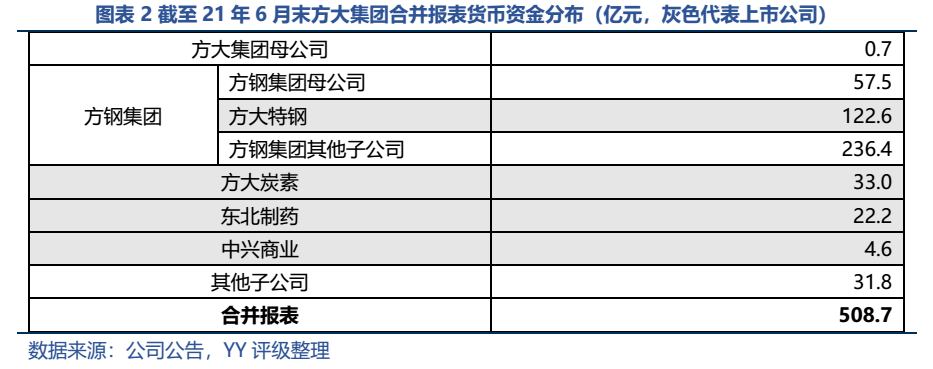 参与海南方大投资的还有方钢集团及旗下的九江萍钢、萍乡萍钢、达州钢铁。不同于方大集团母公司的是,方钢集团的货币资金相对较充裕。截至21年6月末集团货币资金达416.5亿元,较20年末新增了170.7元(非上市部分增加了110亿元),主要依赖票据融资(上半年应付票据从66.1亿元增长至224.2亿元)。