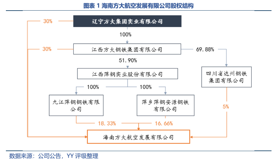 本次战略投资较大概率以海南方大航空发展有限公司这家公司(以下简称“海南方大”)为载体进行。2021年6月,方大集团联合其子公司江西方大钢铁集团有限公司(以下简称“方钢集团”)、方钢的三个子公司联合成立了海南方大航空发展有限公司,注册资本高达300亿元。目前,方大集团持股30%,方钢集团持股30%,方钢集团的三个子公司九江萍刚、萍乡萍钢、达州钢铁分别持股18.3%、16.7%、5%。意味着并购资金方大集团母公司仅需承担30%,30%由方大钢铁集团承担,剩余40%由方钢集团三家子公司承担。所以整体方大集团和方钢集团3:7。