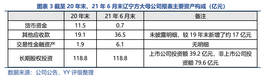 虽然方大集团合并报表货币资金较充裕(截至21年6月末达到508.7亿元),但都在子公司层面,母公司货币资金仅0.66亿元。那母公司的收购资金从何处来呢?由于母公司报表长期股权投资21年6月末数据和20年末数据完全相同,因此我们认为虽然海南方大6月份已经成立,但截至6月末股东还未实际投入资金。我们以母公司中报数据切入来看母公司层面有哪些可动用的资源。