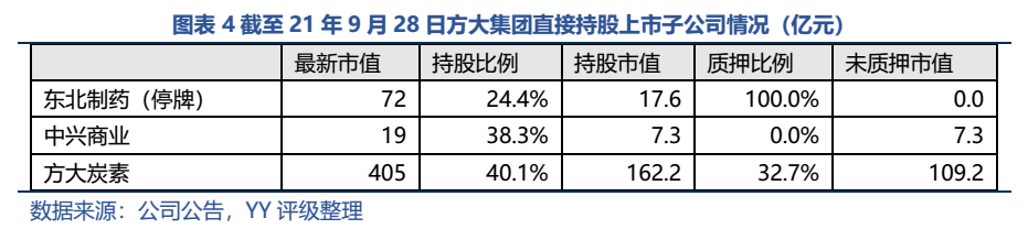长期股权投资方面,上市公司投资额39.2亿元,非上市公司投资额79.6亿,我们对于上市公司投资额部分以市值来看其腾挪空间。东北制药的股票目前处于停牌状态,且方大集团持股市值全部质押,难以动用到海航身上。主要可动用资源包括方大炭素的股票未质押市值约110亿元、中兴商业的股票未质押市值约7亿元,可进行减持套现或者质押融资。