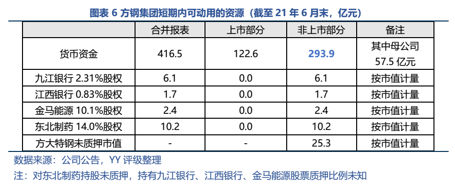 方钢集团资产主要由萍钢实业(九江萍钢、萍乡萍钢的母公司)、达州钢铁、上市公司方大特钢、母公司资产构成,因此我们以集团报表扣除上市公司方大特钢部分来计算集团方钢系可以为收购海航短期动用的资源。