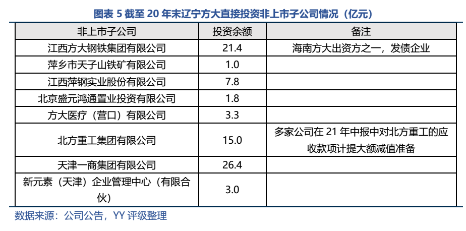 非上市公司部分,截至20年末投资明细如下(估计21年上半年未发生变化)。方钢集团(上市公司方大特钢的母公司)为发债企业,截至21年6月末其账面归母净资产218亿元,方大集团对其100%持股,母公司报表采用历史成本法仅计入投资额21.4亿元,若处置部分股权能释放不少资金。其他公司透明度较低,且作为非上市公司,预计短期内处置变现的难度也较大。