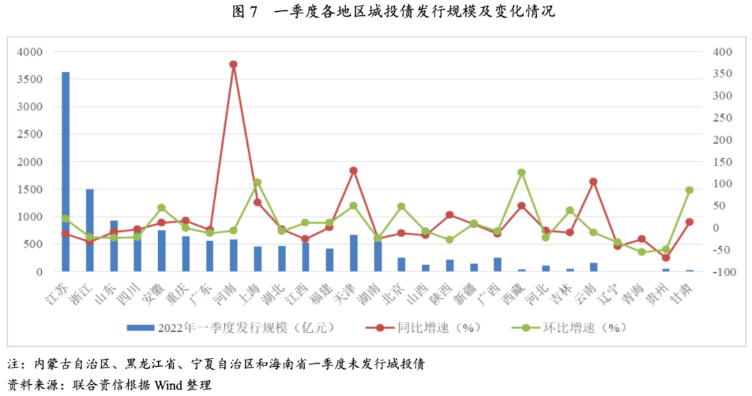 一季度,江苏城投债发行规模仍大幅领先其他地区,不同地区城投债发行规模分化明显。河南“永煤事件”影响逐步消退,天津市政府多次召开恳谈会,两地融资环境有所修复,城投债发行规模同比大幅上升。而江苏、浙江、江西和湖南发行规模同比有所萎缩,主要系区县级城投企业较多,严监管下区县级城投债发行受到一定限制。此外,贵州、青海、辽宁等地发行规模明显下降。净融资方面,主要发债省份净融资规模同比和环比均出现不同程度收缩,河南、天津、吉林城投债净融资转正,东北、西北和西南地区城投债净融资存在缺口,贵州、甘肃、辽宁、内蒙古等地城投债融资延续2021年四季度以来净流出状态,城投债余额持续收缩。