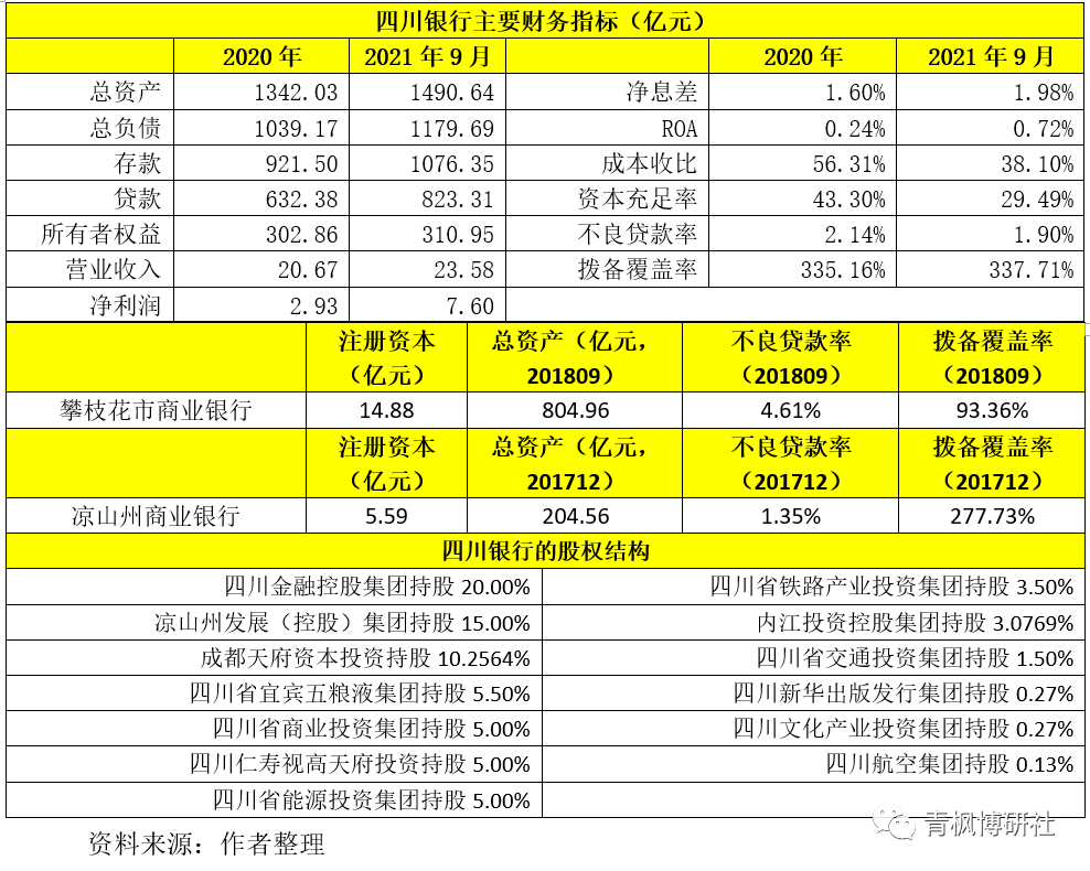 4、截至2021年9月底,四川银行总资产达到1490.64亿元、存贷款余额分别为1076.35亿元和823.31亿元,实现营收23.57亿元、净利润7.60亿元、不良贷款率为1.90%、拨备覆盖率为337.71%、资本充足率达29.49%。
