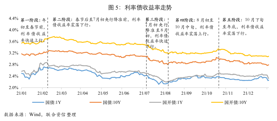 2021年利率债收益率总体呈“前高后低”态势。从利率债收益率走势看,主要分为五个阶段。第一阶段:年初至春节前,利率债收益率快速上行。随着永煤违约事件对市场的冲击逐渐消退及资金面实现平稳跨年,央行开始回收流动性,资金面逐步收紧,市场流动性预期由乐观转向谨慎,利率债收益率快速上行。第二阶段:春节后至7月初央行降准前,利率债收益率震荡下行。这一阶段,央行货币政策坚持“稳字当头”,资金面总体平稳偏松,加之地方政府专项债额度下发较晚且发行门槛提高导致机构面临“资产荒”,利率债收益率呈震荡下行态势。第三阶段:7月初央行降准至8月初,利率债收益率快速下行。进入2021年下半年,中国经济下行压力逐渐显现,7月9日央行实施全面降准。全面降准在释放流动性的同时带动市场降息预期升温,从而带动利率债收益率快速下行。第四阶段:8月初至10月中旬,利率债收益率震荡上行。8月以来,地方政府债发行明显提速,央行结构性宽松货币政策也加速推进,带动市场宽信用预期不断升温,叠加结构性通胀压力不断抬升,利率债收益率震荡上行。第五阶段:10月下旬至年底,利率债收益率震荡下行。在保供稳价政策支持下通胀压力有所缓解,央行通过灵活主动的公开市场操作维持了市场流动性的合理充裕,12月央行二次降准落地、支农支小再贷款利率下调及1年期LPR下调进一步提振市场降息预期,利率债收益率震荡下行。
