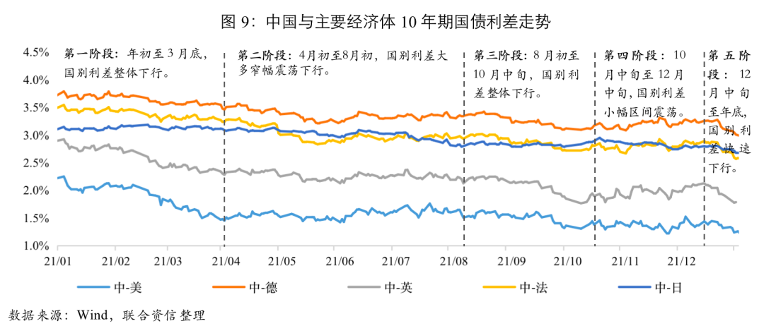五、国别利差:2021年国别利差“前高后低”,2022年或小幅震荡下行